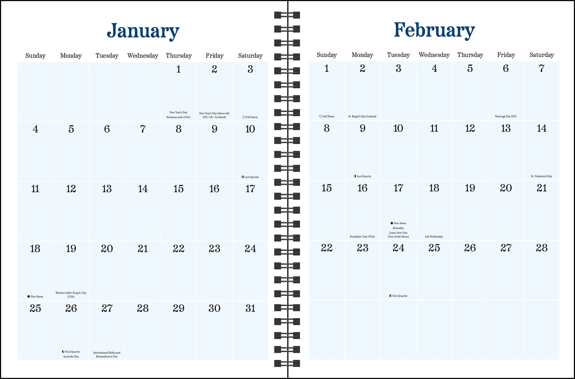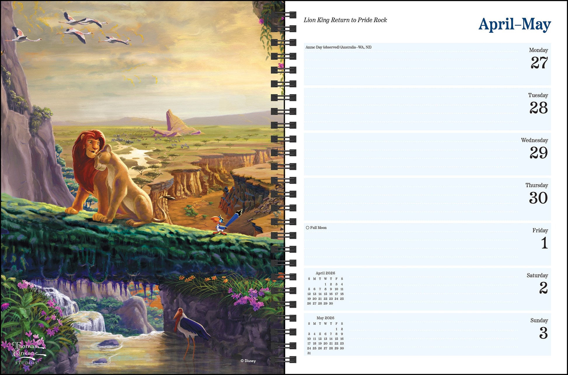 The Disney Dreams Collection by Thomas Kinkade Studios 2026 Engagement Calendar lays flat when open to any page and features a storage pocket inside the front and back covers. It includes years and months-at-at-a-glance for reference as well as weekly planning pages to keep track of appointments, deadlines, and special occasions. There are also pages in the back for notes and contacts.