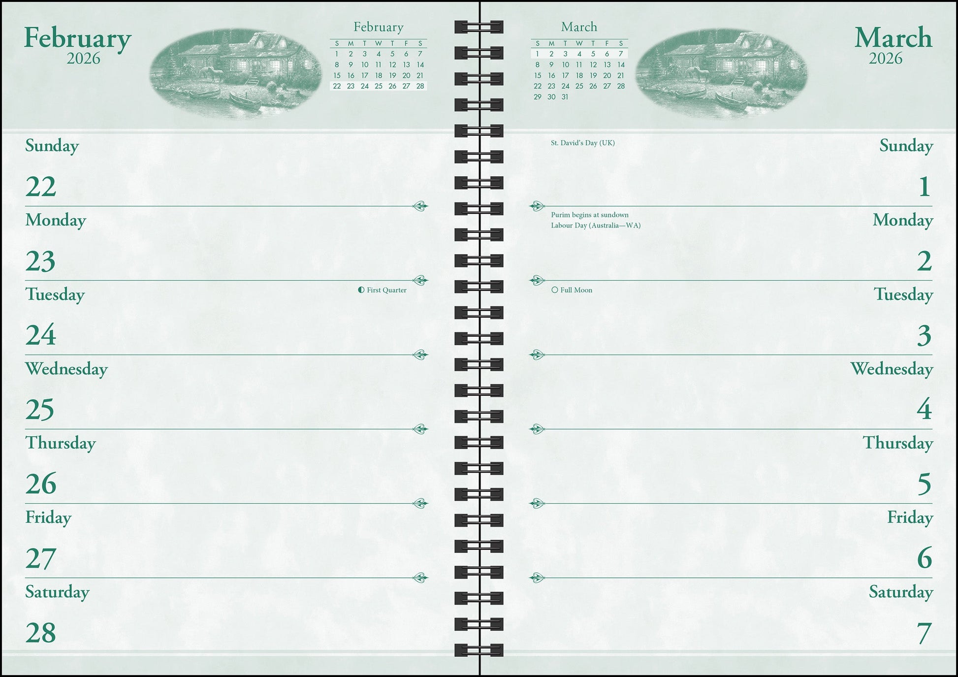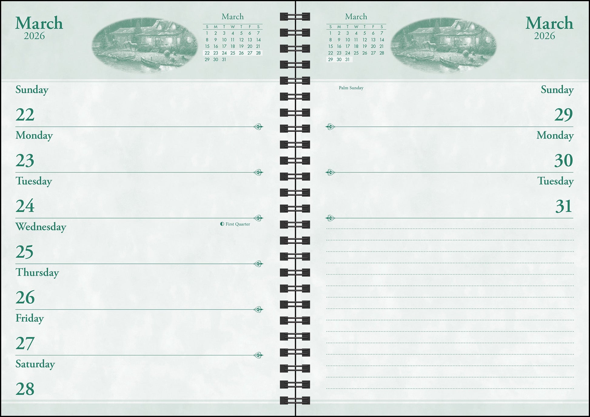 This 12-month calendar features a durable, fully designed hard cover, sturdy tab dividers with full-color image details from paintings by Thomas Kinkade Studios, a moveable page marker, convenient storage pockets, and plenty of room to write in your own appointments, reminders, and special occasions. Bible verses are included throughout the calendar for reflection or memorization. Images featured in the 2026 calendar include Winter Chapel, Hummingbird Cottage, Simpler Times II, A Perfect Fall Day, Country Christmas Homecoming, and more.
