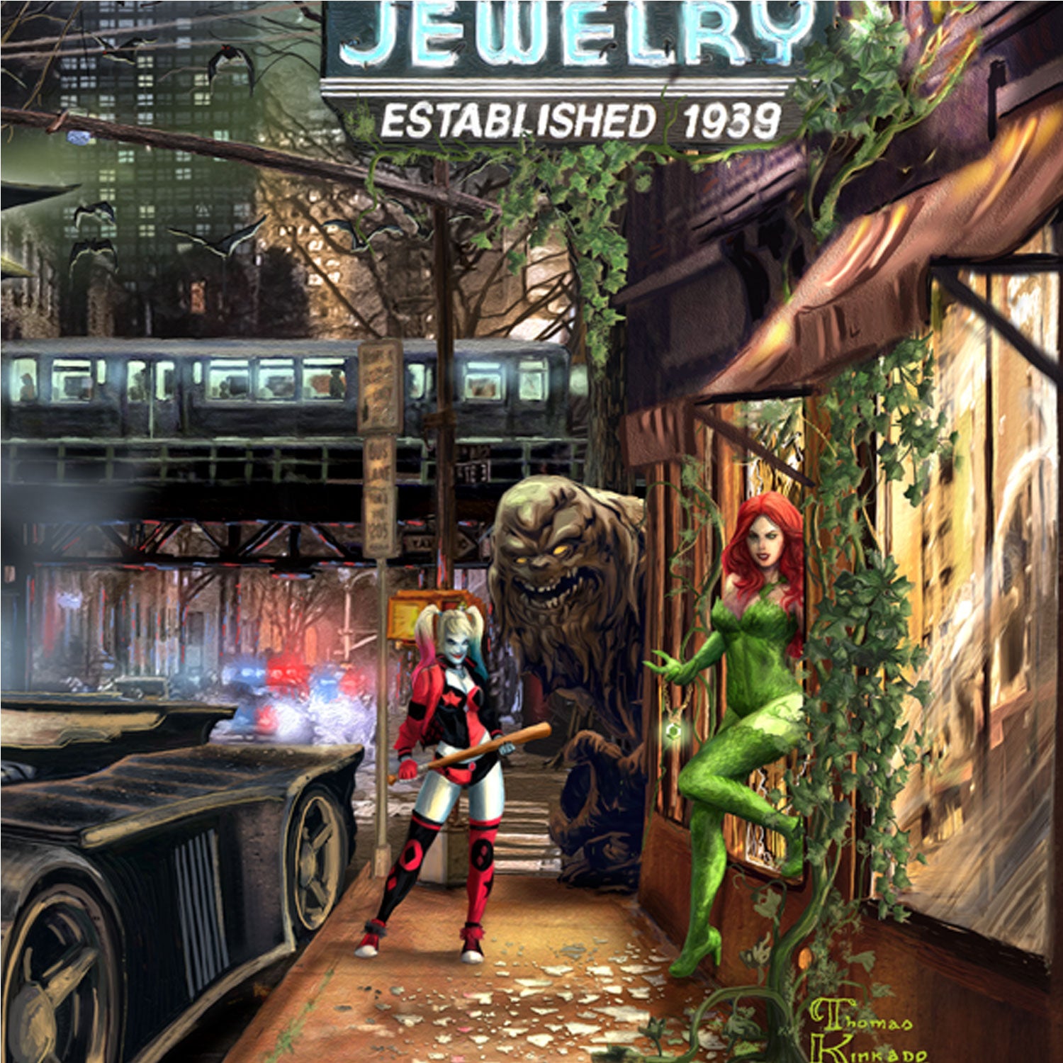 Since its inception, Gotham City has been overrun with crime and corruption, and immortalized as a dark, foreboding city. As the years went by, Gotham City seemed to dive deeper and deeper into darkness, but from that darkness arose one of DC’s greatest Super Heroes: Batman. In Batman™ Gotham City™ by Thomas Kinkade Studios, Batman jumps off the Batmobile parked on a Gotham City Street, as he is responding to the Bat-Signal. Every night in this metropolis provides an electrifying new battle against evil, and this painting captures the excitement and danger that accompanies Batman in his quest to rid the notorious city of crime.