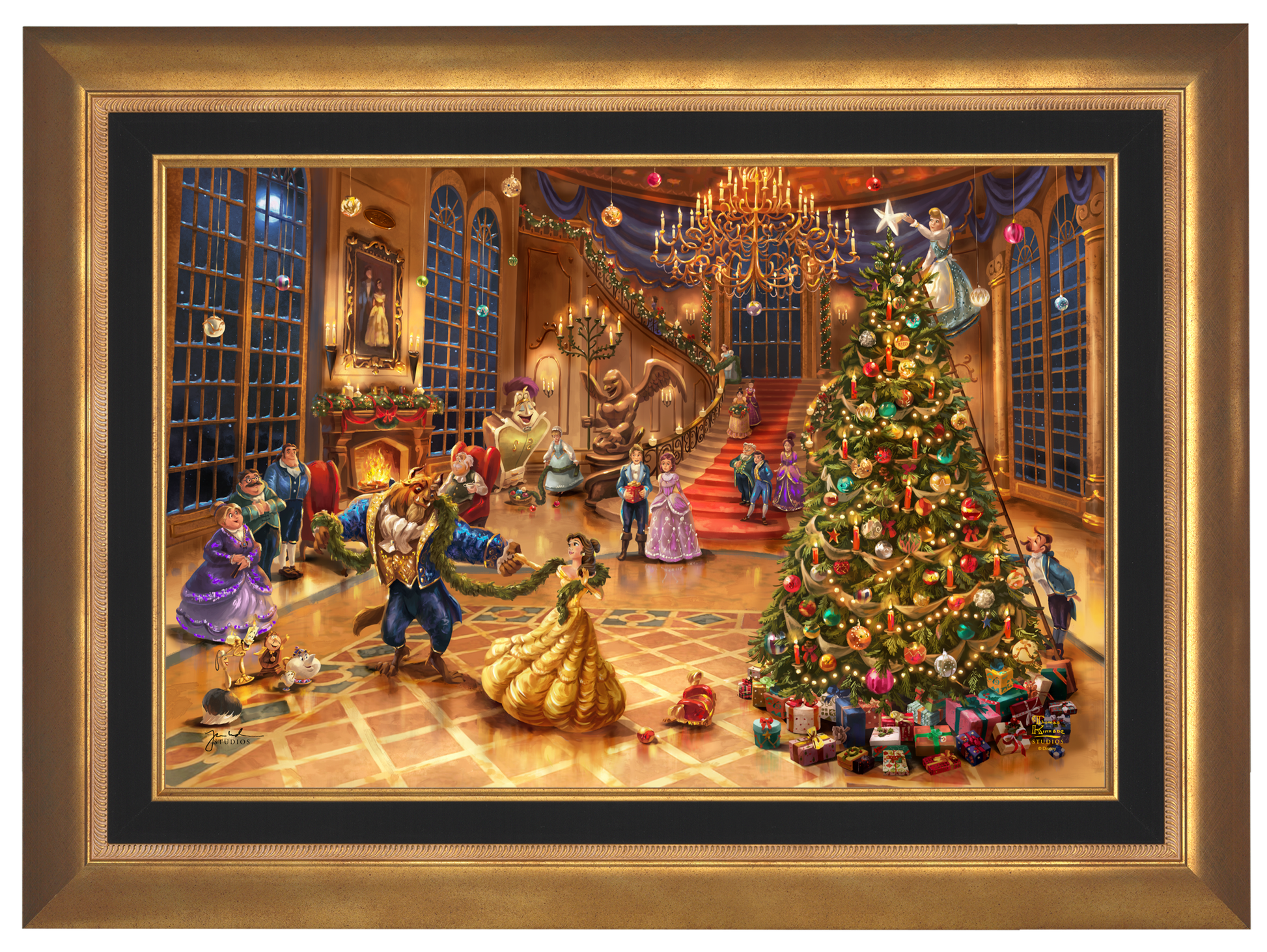The friendship between Belle and the Beast has blossomed into true love. What perfect time than Christmas to celebrate this new beginning than with cherished family and friends. As Belle and the Beast dance in the brightly lit ballroom, finishing touches are being applied to the majestic Christmas tree. Mrs. Potts, Chip, Cogsworth, Lumiere, Fifi, FrouFrou and Wardrobe watch with smiling faces, and yearn to join the pair in the colorful festivities. Thomas Kinkade Studios proudly presents Disney Beauty and the Beast Christmas Celebration.