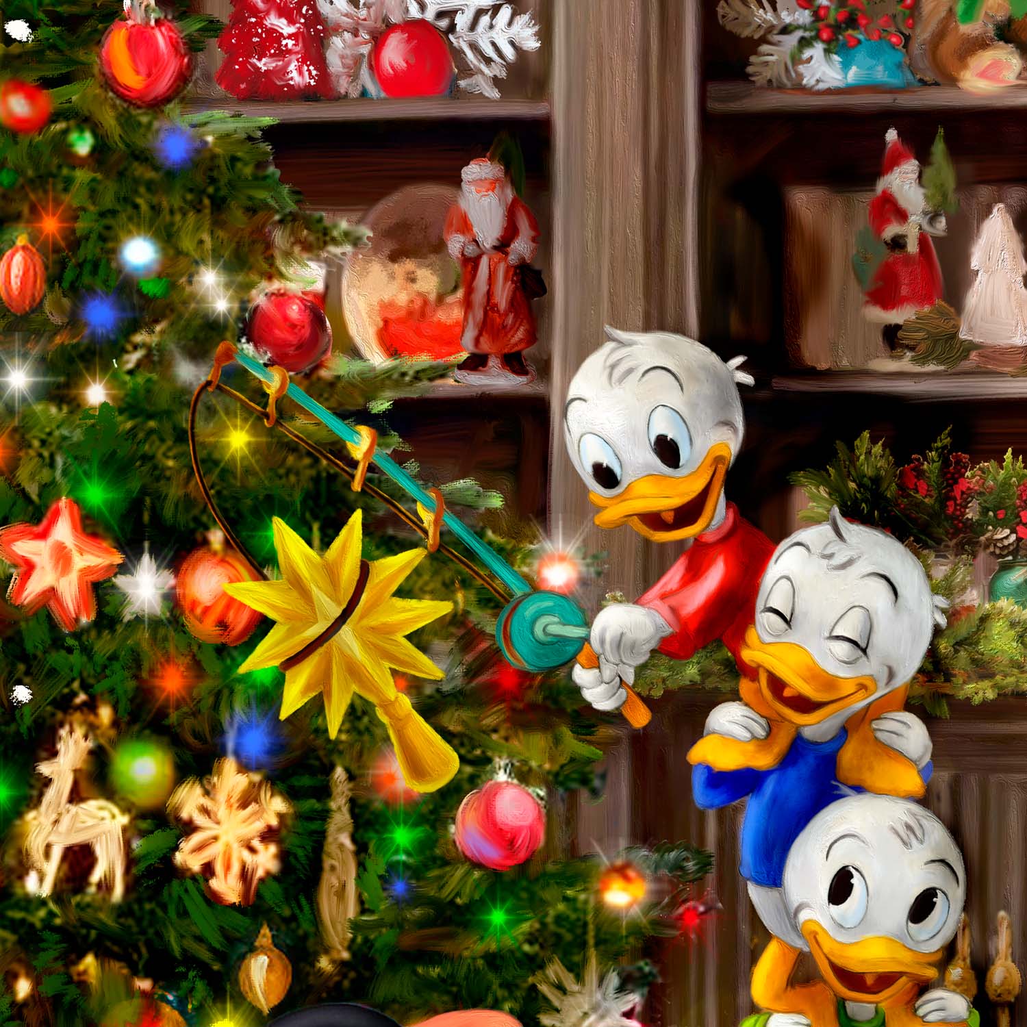 A bright full moon is illuminating the interior of the cottage where Mickey Mouse and Minnie Mouse are taking a small break from decorating to enjoy some hot chocolate and cookies. Daisy Duck is trying to choose the next ornament to hang on the tree from the basket that Donald Duck is holding for her. Goofy has lifted his son in the air so that Max can place an ornament higher up on the tree. Huey, Dewey and Louie have cleverly strategized how to hang the bright star on top of the tree. Who knew a fishing rod could come in so handy? Pluto has mistakenly confused an ornament for a ball, and the whimsical duo of Chip and Dale are causing a bit of chaos on the fireplace mantle.