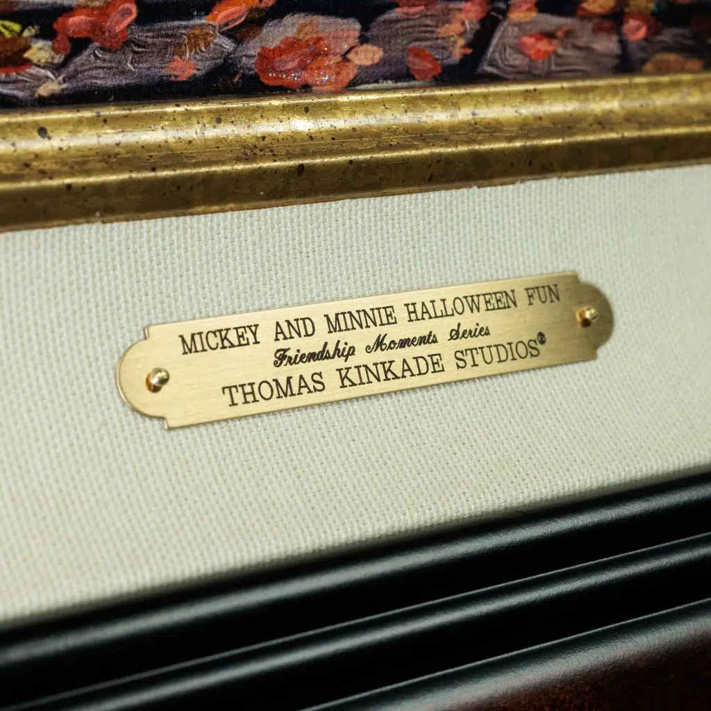 Thomas Kinkade was a life-long admirer of Walt Disney and the wonderful characters he created. In collaboration with Disney, Thomas Kinkade Studios has created the Friendship Moments series, a collection of art featuring favorite characters and their best friends painted in beautiful Kinkade settings. Thomas Kinkade Studios presents the fifth painting in the Friendship Moments series, Disney Mickey and Minnie Halloween Fun. The evening mood is set as the sky darkens and bats take flight to join some of our favorite Disney friends for a night of fun adventure. A bright full moon illuminates the cobblestone path that leads from a spooky mansion just visited by Mickey Mouse, Minnie Mouse, Huey, Dewey, and Louie. Dressed in their whimsical costumes, they embark on a fun night of trick-or-treating. Their path is decorated with elaborately carved pumpkins with the faces of Donald Duck, Daisy Duck, Pluto, and Goofy. The adorable duo of Chip and Dale have mischievously hidden in one of the carved pumpkins hoping to catch some candy that may fall from Mickey’s pumpkin bucket.