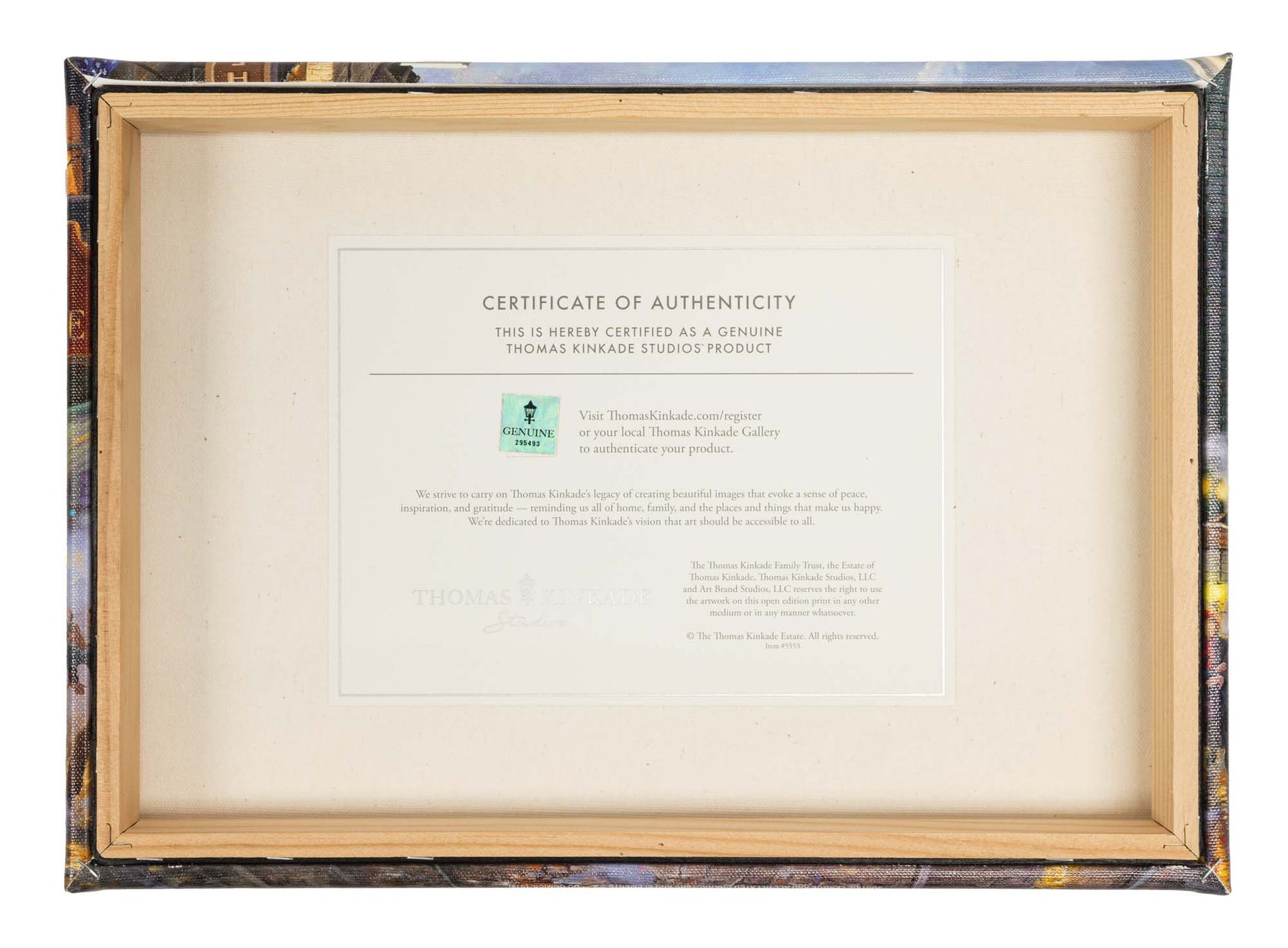 Thomas Kinkade Studios Gallery Wraps are perfect for any space. Each wrap is crafted with our premium canvas reproduction techniques and hand wrapped around a deep, hardwood stretcher bar. Hung as an ensemble or by itself, this frame-less presentation gives you a versatile way to display art in your home.