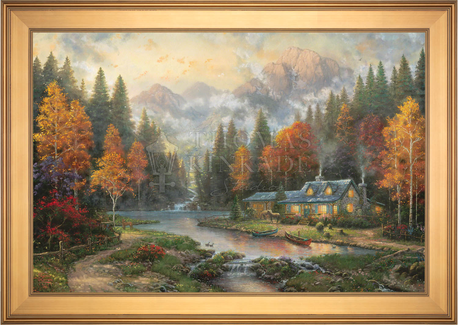 Autumn is a special time of year. When the crisp cold air flows down from the north and the leaves explode into vibrant hues of orange, yellow and red, one gets a sense of time passing, of another year coming to an end. It is the last flash of color before the world falls into winter and the promise of spring's rebirth begins. Evening at Autumn Lake captures that time of year when the nights become long and the world readies itself for a nap under a snowy blanket. Thomas Kinkade loved this season for the color it provided his palette, but also for the mood it created in the mountains he roamed as a young man. Thom grew up in the Sierra-Nevada's and that majestic range is where he first honed his immense talents as a landscape artist.