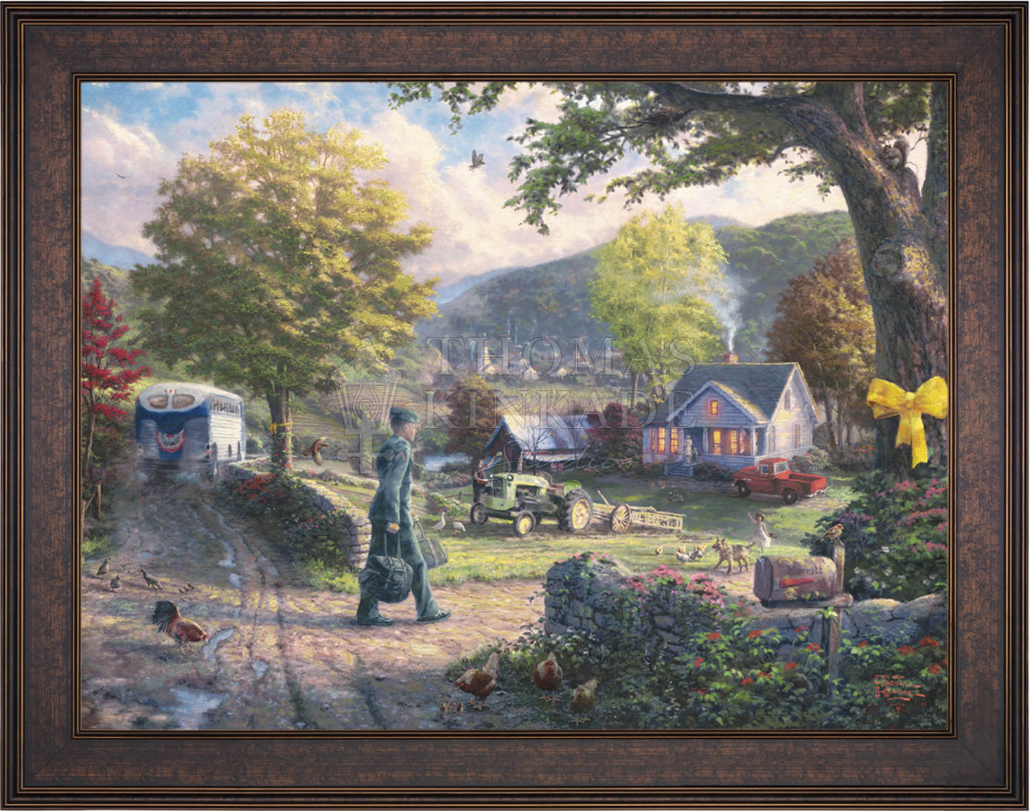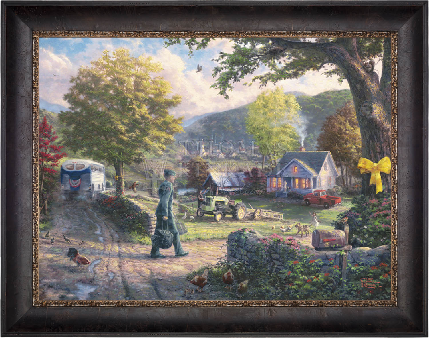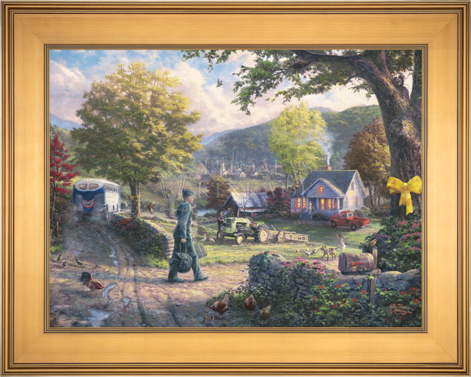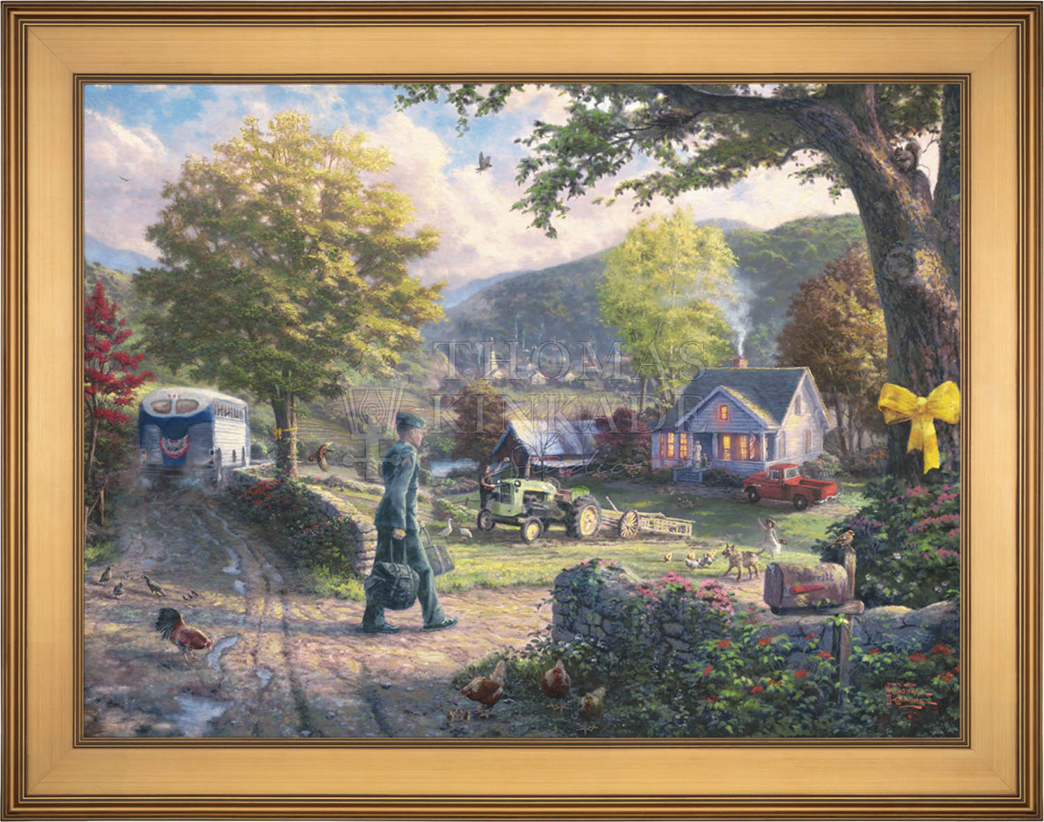 In Homecoming Hero, I envision a simple country setting containing all the elements of home that soldiers from every branch of the military have always fought for, regardless of their place in history-security, peace, tranquility, family and community life. My inspiration for this image came from Norman Rockwell's The Homecoming Marine, the most collected cover in the rich history of the Saturday Evening Post. The homecoming soldier is greeted by his family, reminding us that life can once more return to normal.