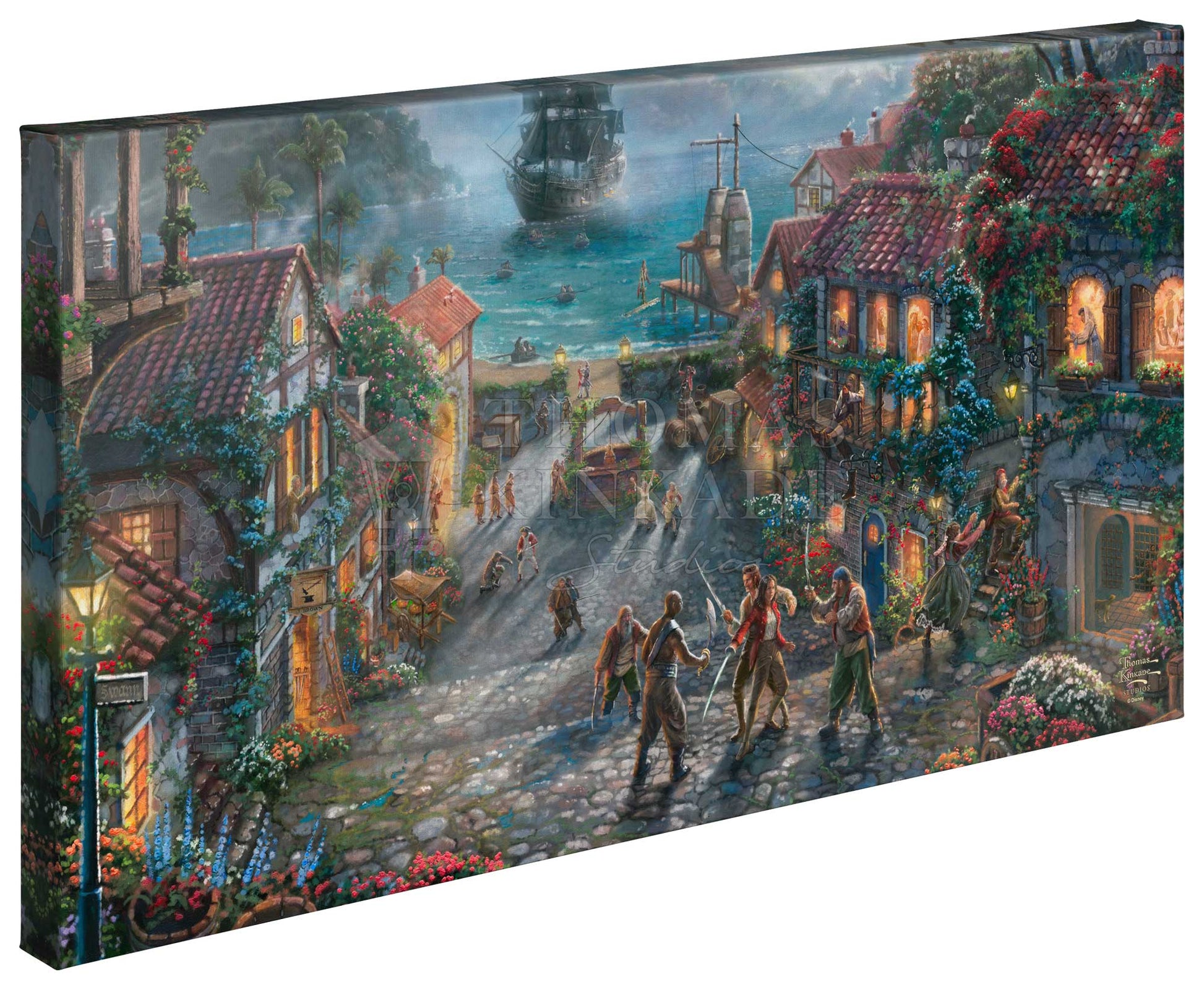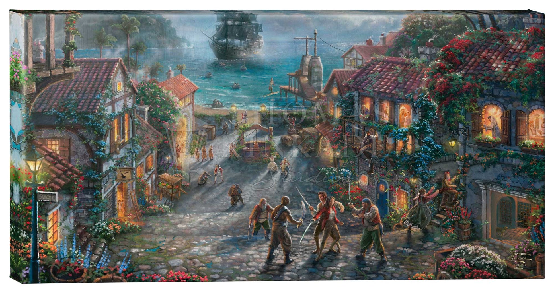 From the first moments we climb into our boat on the Pirates of the Caribbean ride singing, "It's a pirates life for me," or view those wondrous opening frames of any of the Pirates' movies, we are captivated by the spirit of adventure mixed with romance. It's a fun adventure filled with memorable moments. Captain Jack Sparrow makes his grand entrance as his ship slowly sinks in the harbor of a portside town. A mischievous mutt can be seen taunting pirate prisoners. Will and Elizabeth are fighting pirates back-to-back while resisting the inevitable pull of true love.In Pirates of the Caribbean, The Curse of the Black Pearl, the Thomas Kinkade Studios celebrate these iconic characters and films, which so vividly remind us of a life of passion and adventure.