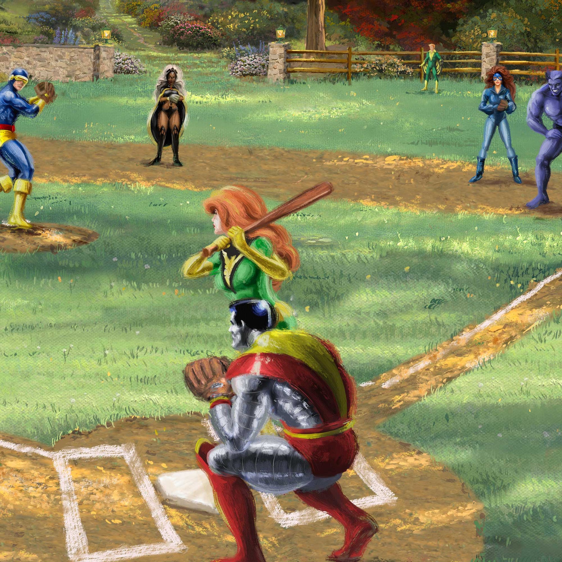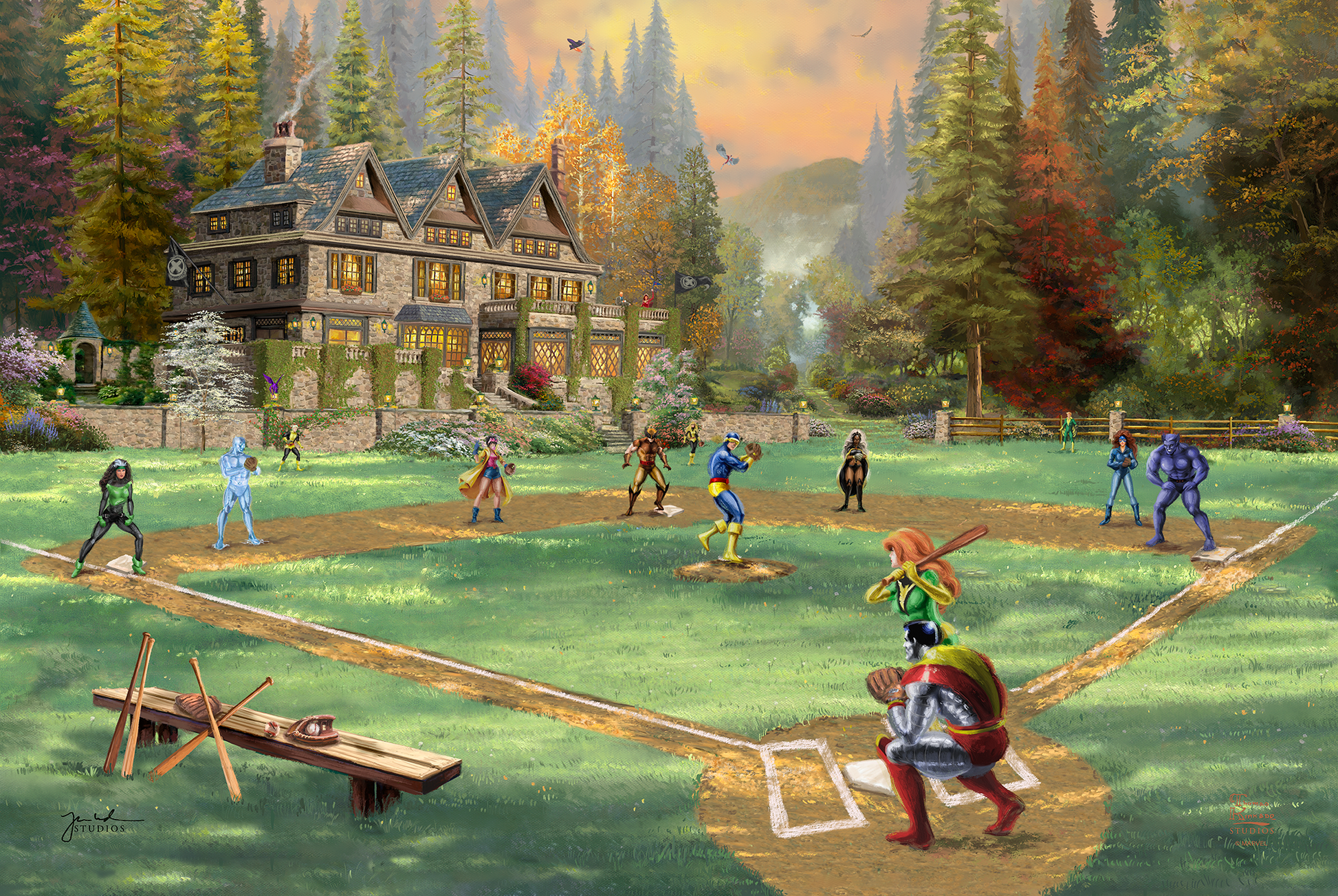 Thomas Kinkade Studios is proud to present our newest Limited Edition Art collaboration with Marvel – X-Men. In this scene, Professor Xavier has gathered the Super Heroes to square off against each other in a friendly baseball game to build their teamwork further. The Golden Rule of this game is, “Play without the use of your Super Hero powers.” As Cyclops pitches to his girlfriend Jean Grey, Professor X sits quietly at the mansion, acting as umpire using his telepathic ability. Which side will win the game, or are the X-Men even keeping score?