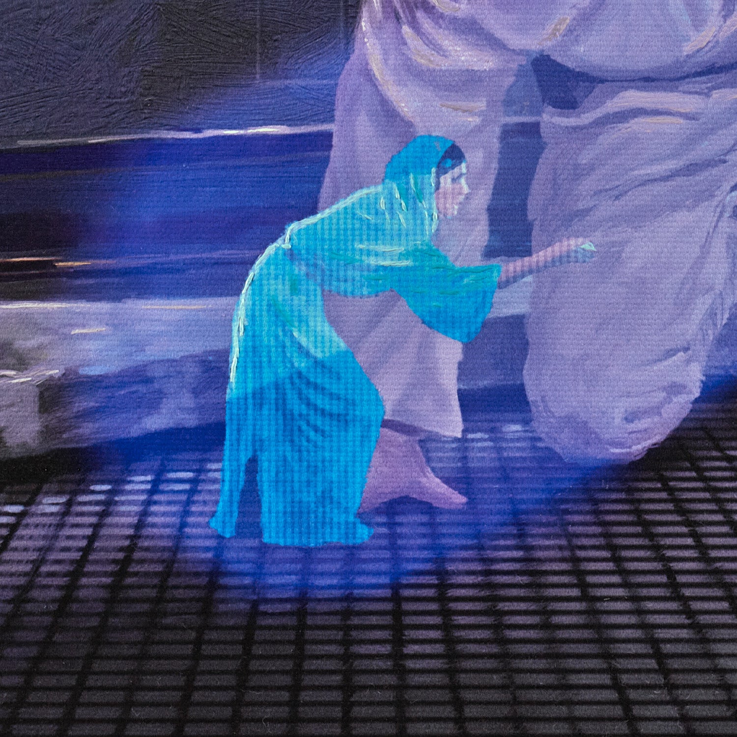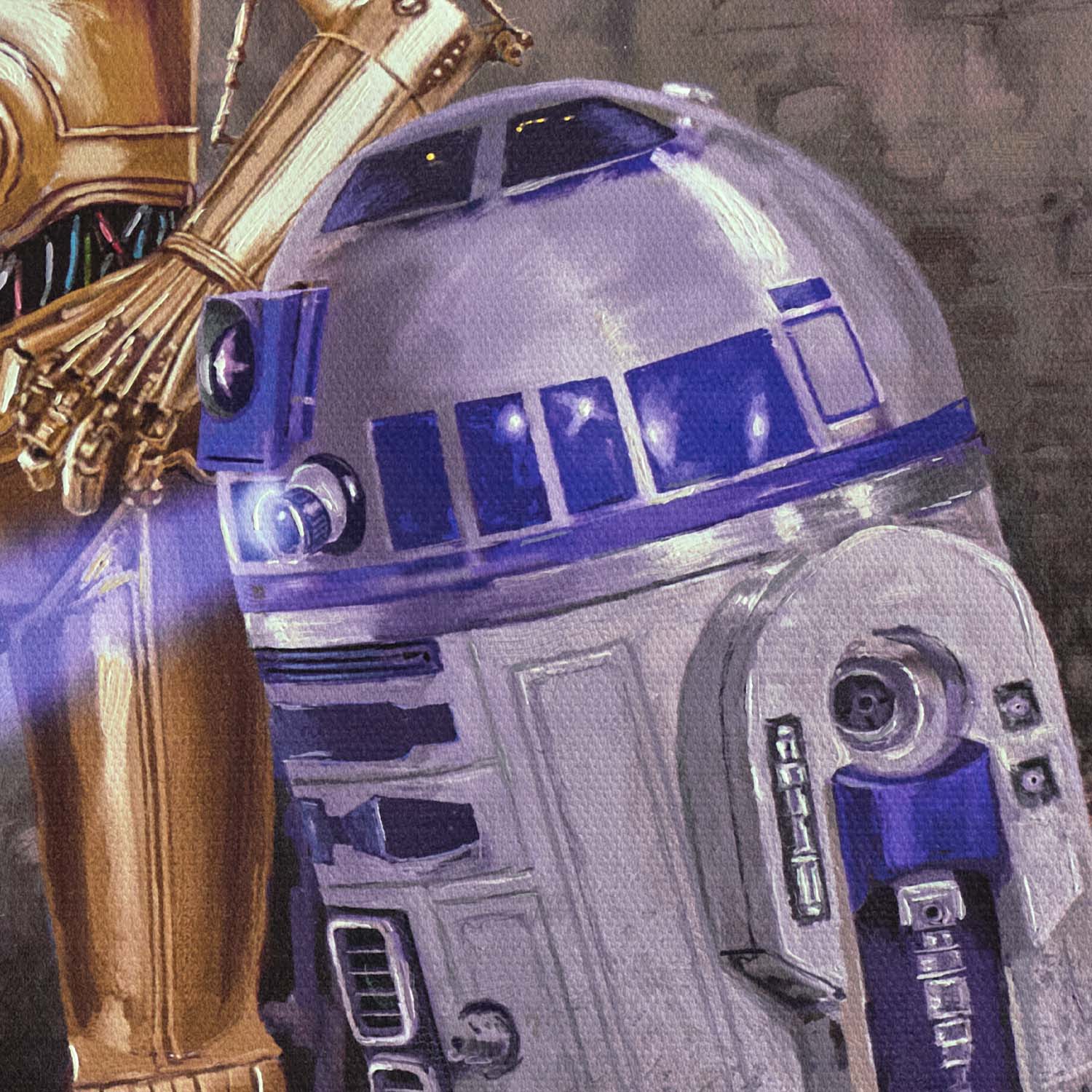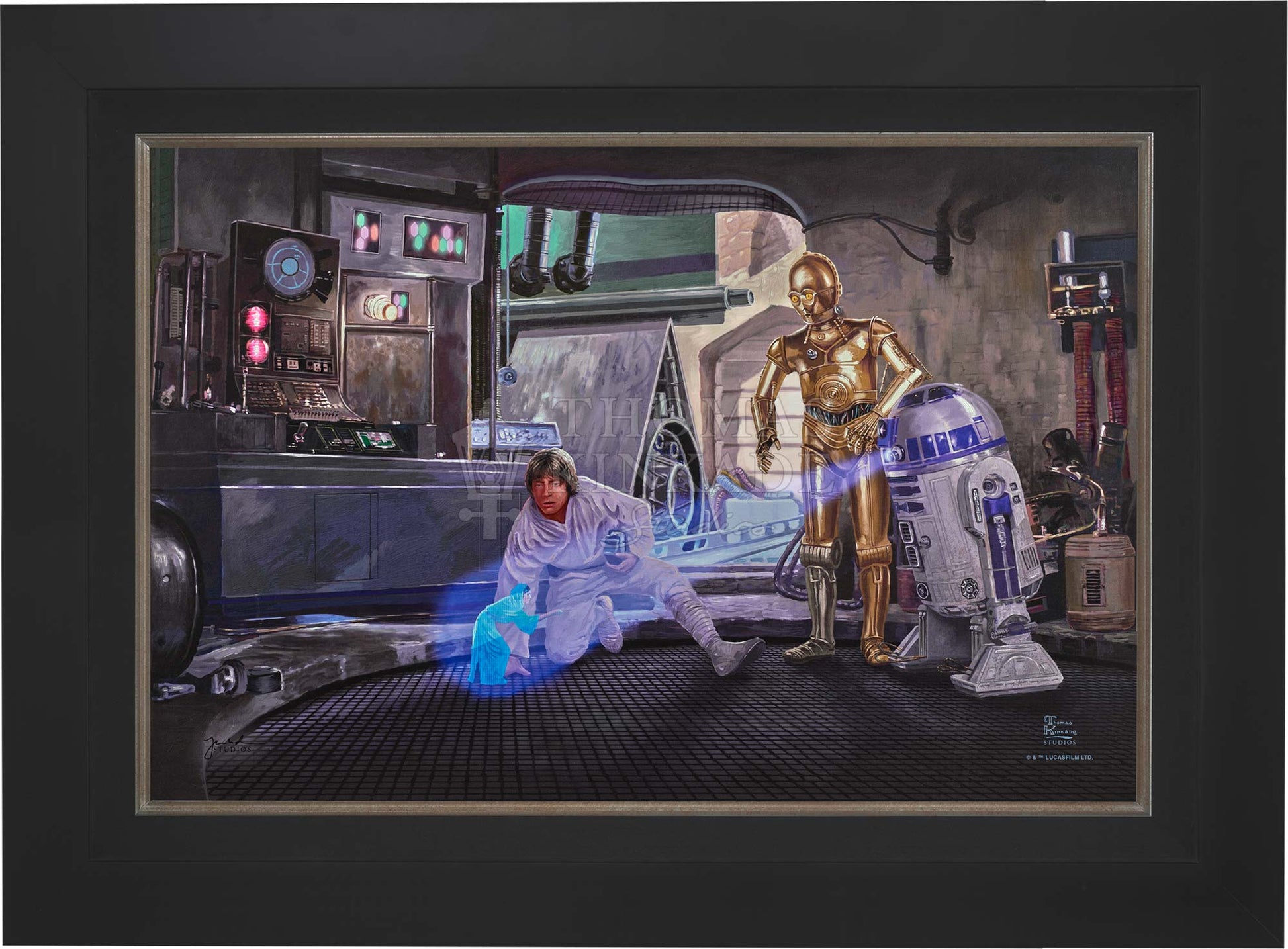 To escape the battle, C-3PO™ and R2-D2 had taken refuge in an escape pod and now find themselves stranded on the sands of Tatooine™. Not clear on the safest path to take, C-3PO and R2-D2 go in separate directions but both are captured by scavenging Jawas™. Sold by the Jawas to Uncle Owen, Luke Skywalker™ has the task to clean up the Droids before they start work on the farm. While Luke is removing carbon scoring from R2-D2, he notices something jammed inside and when Luke tries to remove it the hologram of Princess Leia's plea to Obi-Wan Kenobi starts to intermittently play. Thomas Kinkade Studios is pleased to present You're My Only Hope.
